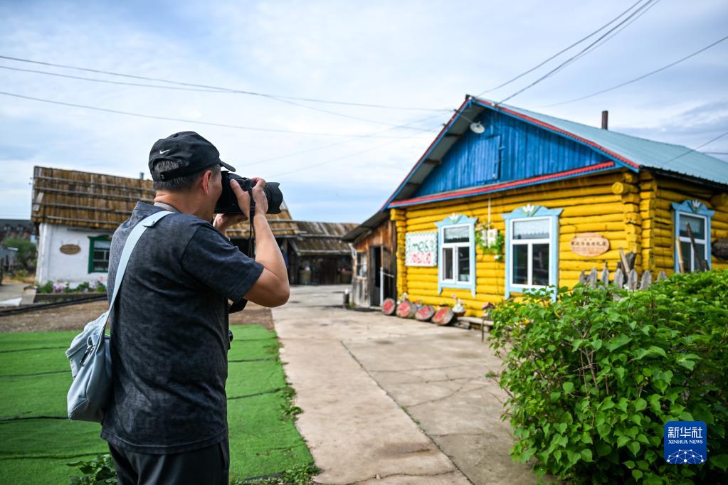 6月28日,一名游客在拍攝考占花家的俄式傳統民居。