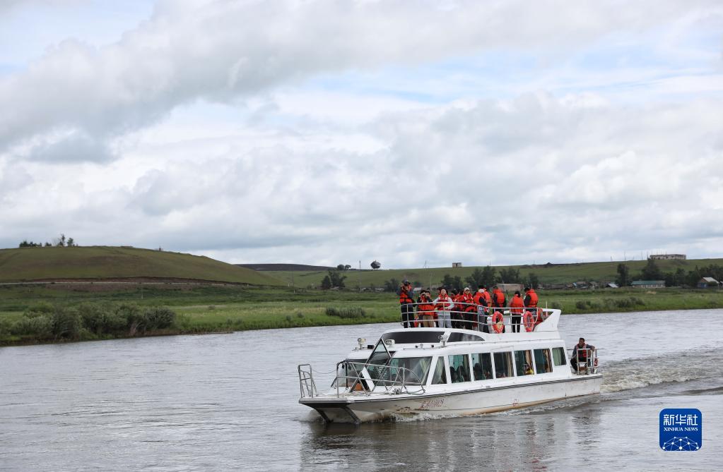 6月29日,游客在蒙兀室韋蘇木境內的額爾古納河上乘船游覽。
