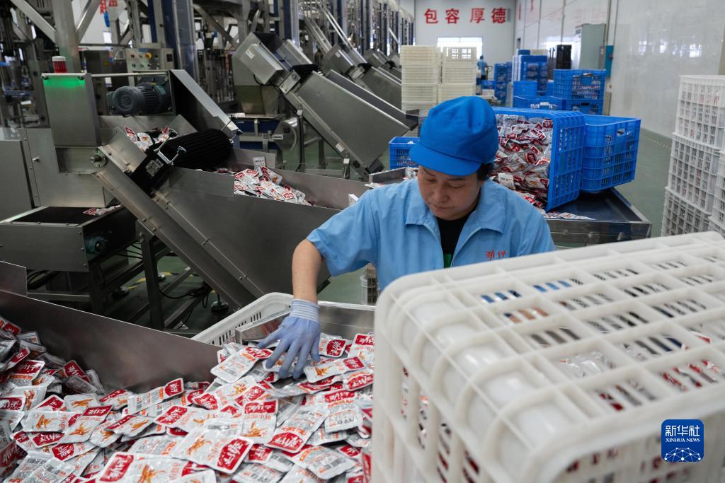 在湖南省岳陽(yáng)市平江高新技術(shù)產(chǎn)業(yè)園,勁仔食品平江生產(chǎn)基地員工在生產(chǎn)線(xiàn)上檢查產(chǎn)品(6月28日攝)。新華社記者 鄒予 攝
