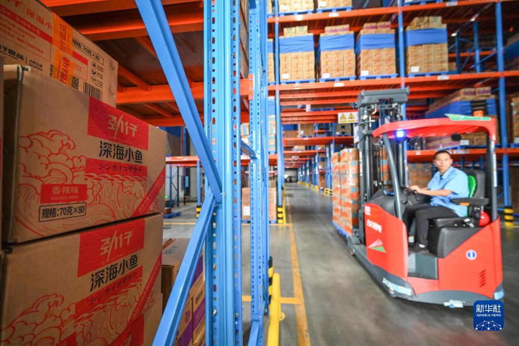 在湖南省岳陽(yáng)市平江高新技術(shù)產(chǎn)業(yè)園,勁仔食品平江生產(chǎn)基地的員工在成品倉庫里駕駛叉車(chē)搬運鳀魚(yú)產(chǎn)品(6月28日攝)。新華社記者 陳曄華 攝