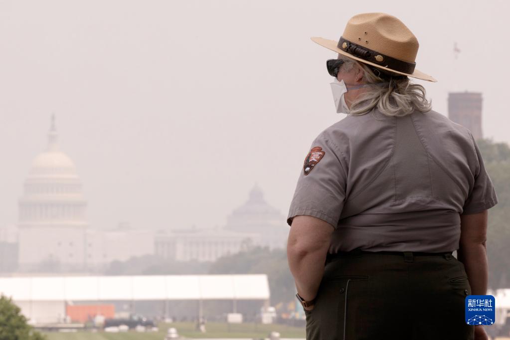 6月29日,在美國首都華盛頓,國家公園的一名員工戴著(zhù)口罩工作,遠處的國會(huì )大廈籠罩在煙霧中。
