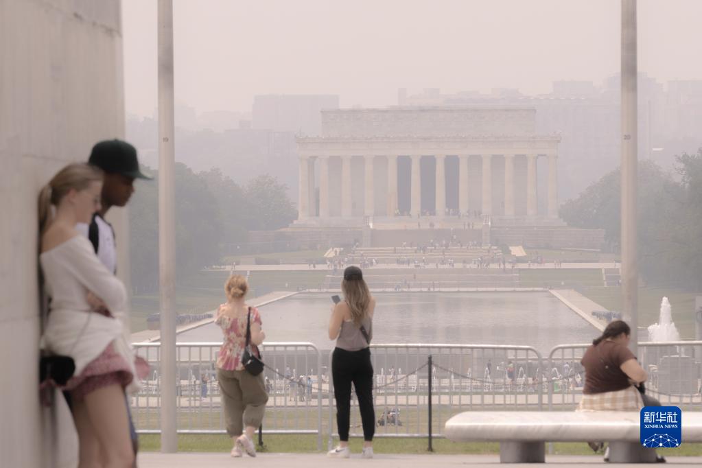6月29日,在美國首都華盛頓,游客在華盛頓紀念碑游覽,遠處的林肯紀念堂籠罩在煙霧中。