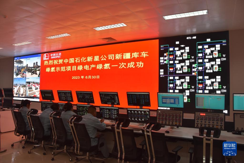 6月30日,中國石化新疆庫車(chē)綠氫示范項目的員工在中控室工作。