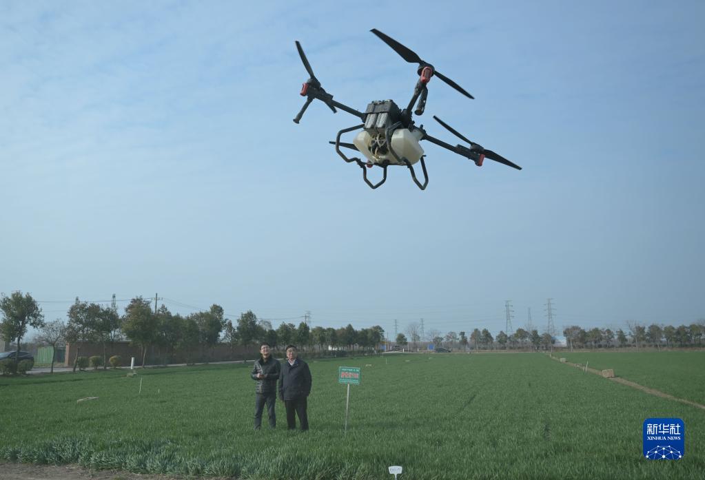 2月21日,在太和縣淙祥現代農業(yè)種植專(zhuān)業(yè)合作社,徐淙祥(右)和孫子徐旭東查看無(wú)人機噴灑農藥。