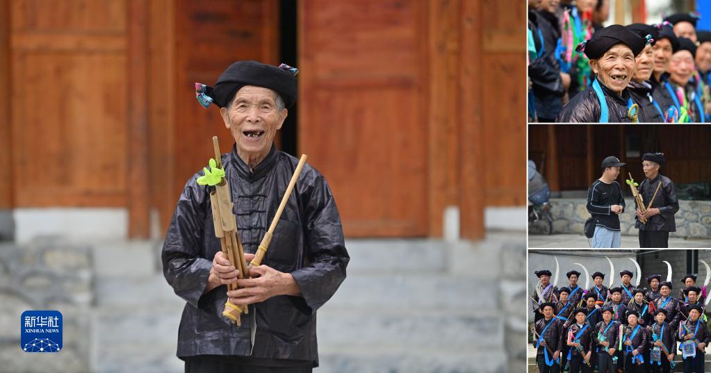 拼版照片:左圖為廣西融水苗族自治縣桿洞鄉堯告村91歲的老黨員余炳萬(wàn)(2023年6月27日攝);右上圖為余炳萬(wàn)在堯告村民俗文化活動(dòng)中(2019年3月12日攝);右中圖為余炳萬(wàn)(右)在指導后輩進(jìn)行苗族非遺文化保護和發(fā)展(2023年6月27日攝);右下圖為余炳萬(wàn)(前排右二)和堯告村拉鼓傳承人隊伍在一起合影(2019年3月12日攝)。