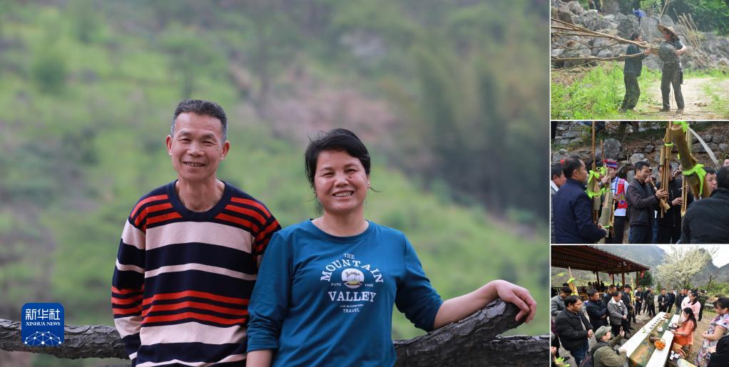 拼版照片:左圖為廣西融安縣東起鄉銅板屯55歲的“60后”黨員龍革雄(左)和妻子羅桂枝(2022年3月20日攝);右上圖為龍革雄和村民們在山上種樹(shù)(2013年5月15日攝);右中圖為龍革雄在學(xué)習吹蘆笙(2023年2月18日攝);右下圖為游客在銅板屯游玩(2023年2月18日攝)。