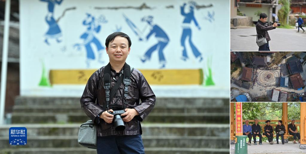 拼版照片:左圖為廣西融水苗族自治縣桿洞鄉堯告村43歲的黨員梁強(2023年6月27日攝);右上圖為梁強在拍攝記錄村里的風(fēng)土人情和民族文化;右中圖為堯告村的民族文化活動(dòng)場(chǎng)面;右下圖為梁強(右二)在向老人們了解非遺文化情況。
