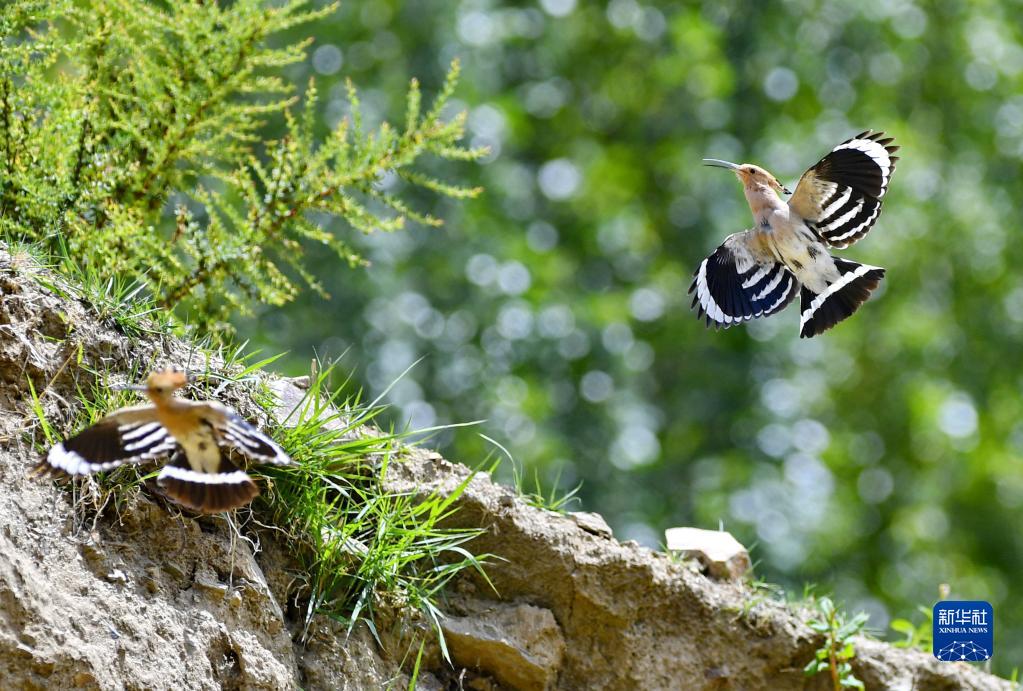 在白定村樹(shù)林邊飛翔的戴勝(6月29日攝)。