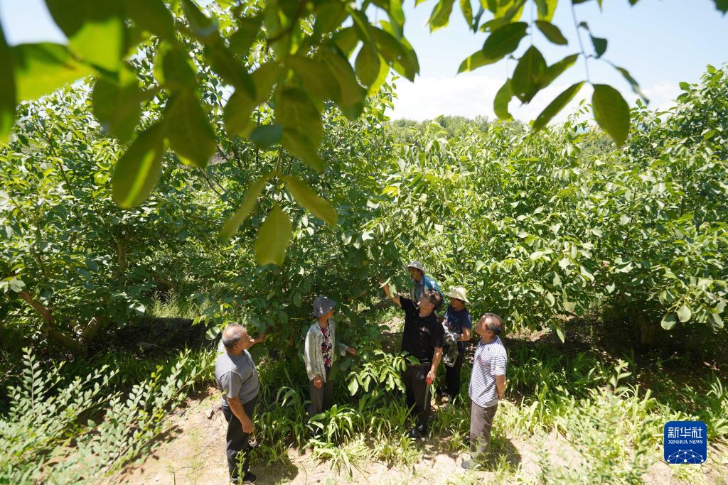 6月30日,賈志華(前右二)在河北省臨城縣賈莊村為農民講解核桃樹(shù)夏季管理知識。