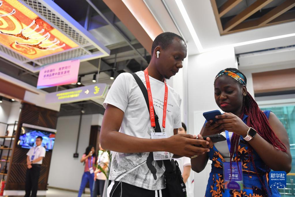 6月30日,在中非經(jīng)貿合作促進(jìn)創(chuàng )新示范園(湖南高橋大市場(chǎng)),來(lái)自剛果(布)的志愿者王榮(右)和參觀(guān)者交換聯(lián)系方式。