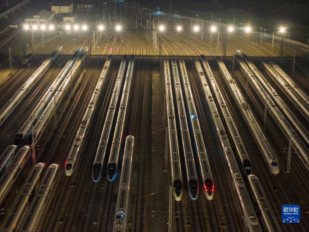 6月30日,動(dòng)車(chē)組列車(chē)??吭谀暇﹦?dòng)車(chē)段南京南動(dòng)車(chē)運用所(無(wú)人機照片)。