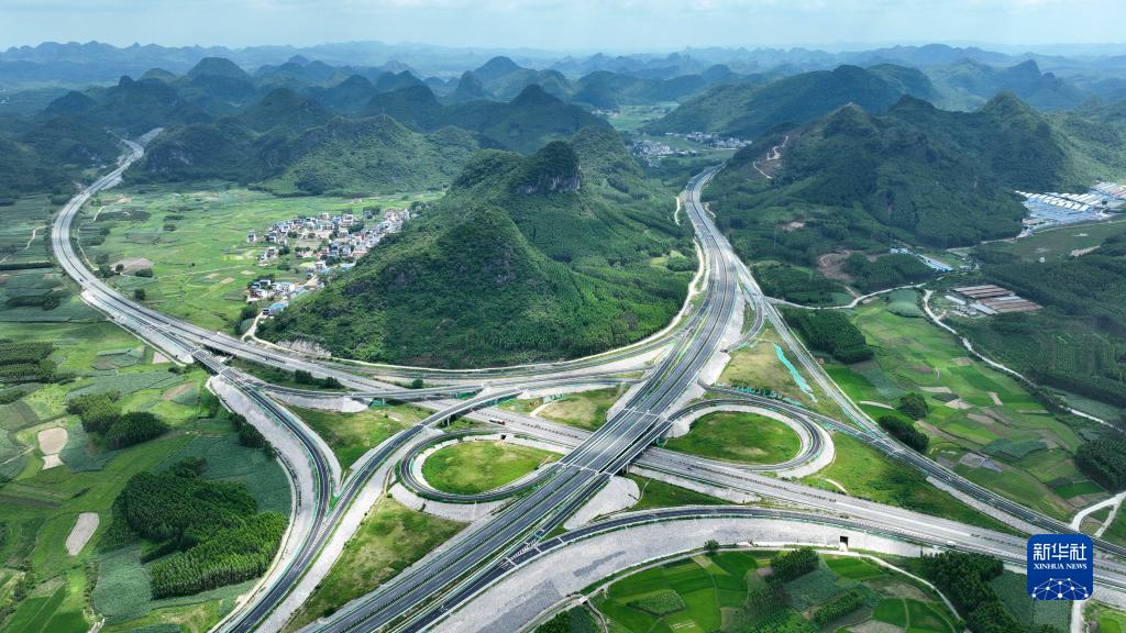 6月30日拍攝的剛建成通車(chē)的廣西賀巴高速象州至柳江段馬坪北樞紐互通(無(wú)人機照片)。