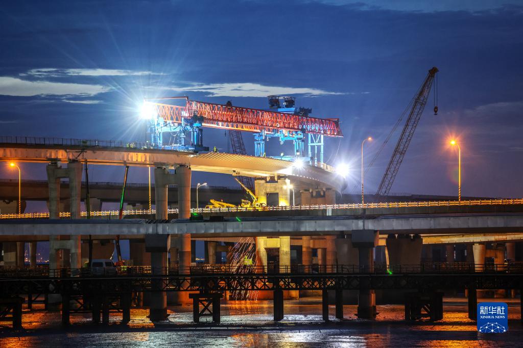 當日,在杭甬復線(xiàn)寧波一期濱?;ネㄊ┕がF場(chǎng),濱?;ネɡ^主線(xiàn)和F匝道兩次上跨之后,第三次成功跨越金塘大橋,為實(shí)現年底建成目標邁出重要一步。新華社發(fā)(姚峰攝)