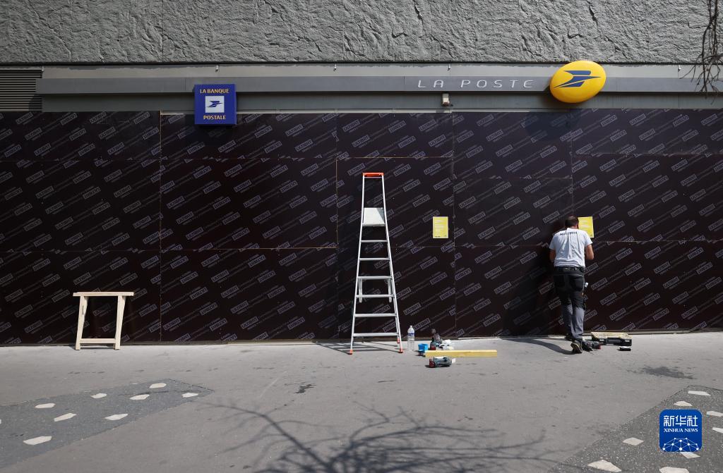6月30日,在法國上塞納省楠泰爾市,工作人員為一家郵局加裝防護板。