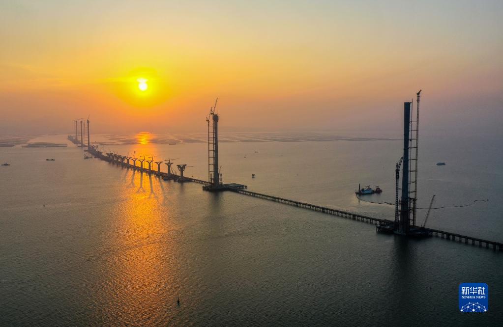 2023年1月9日,高欄港大橋東主塔在跨海通道大橋5座主塔中率先封頂。2023年6月19日,中交路建黃茅??绾Mǖ理椖坎吭诤V?座主塔率先完成首榀鋼箱梁架設,標志著(zhù)項目轉入上部結構施工階段。