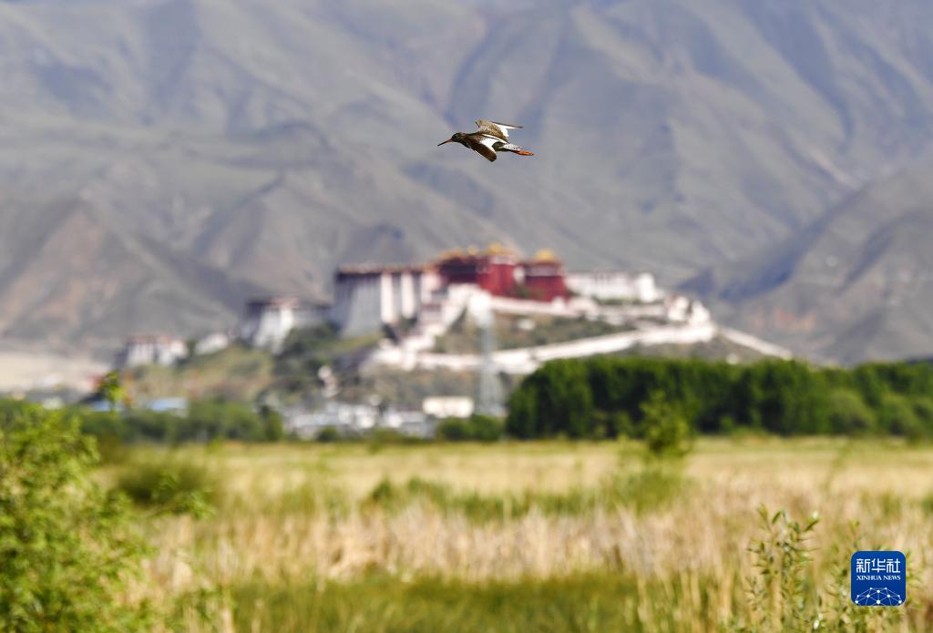 紅腳鷸在拉魯濕地上空盤(pán)旋(6月23日攝)。