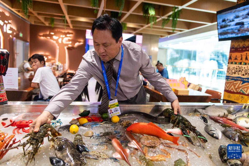 7月1日,在中非經(jīng)貿合作促進(jìn)創(chuàng )新示范園(湖南高橋大市場(chǎng)),參展商在整理產(chǎn)自非洲的海鮮。
