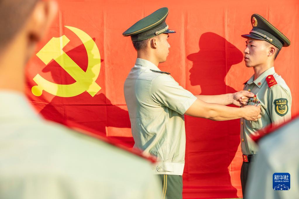 武警廣西總隊桂林支隊開(kāi)展主題黨日活動(dòng),某中隊指導員為新黨員佩戴黨徽(6月29日攝)。