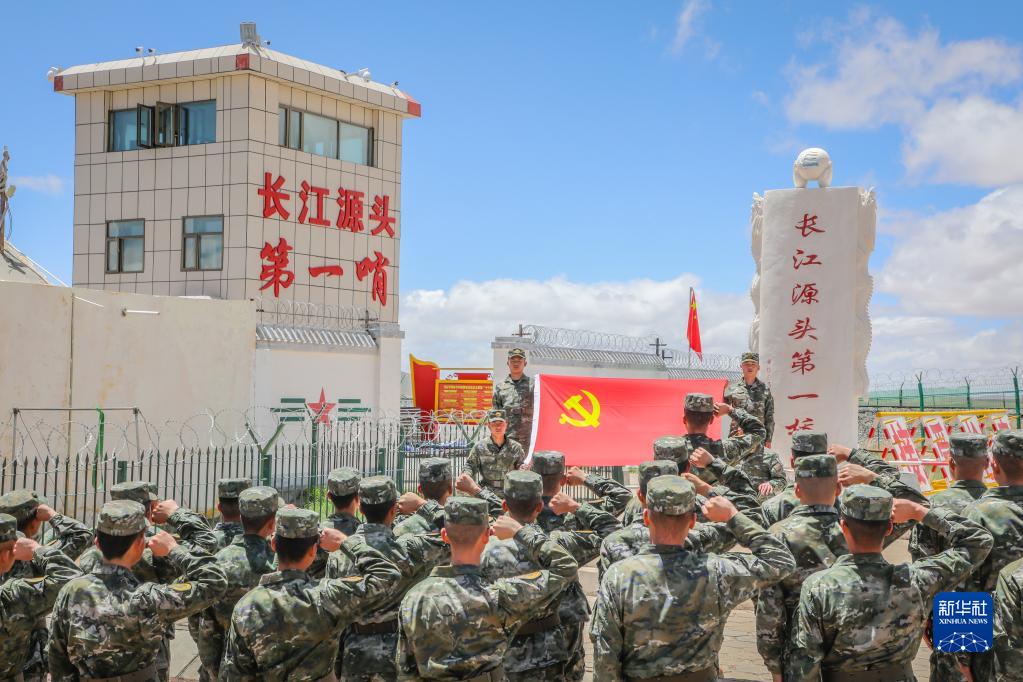 武警青??傟牶N髦ш牻M織黨員干部在長(cháng)江源特大橋哨所開(kāi)展重溫入黨誓詞活動(dòng)(6月30日攝)。