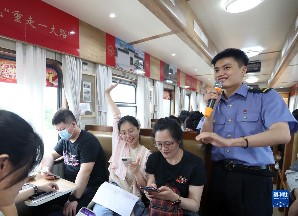 6月30日,上鐵國旅講解員彭曉磊組織旅客參與黨史專(zhuān)題知識互動(dòng)競答。