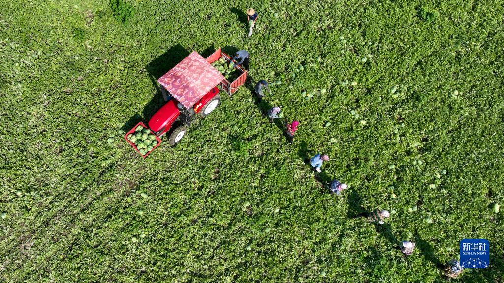 7月1日,河北省唐山市豐南區東田莊鄉亞莊子村農民在搬運采收的西瓜。