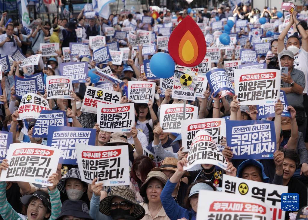 7月1日,民眾手持“反對向海洋排放福島核污染水”等字樣的標語(yǔ)在韓國首爾參加集會(huì )。新華社發(fā)(李相浩攝)