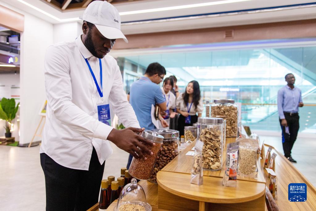 7月1日,在中非經(jīng)貿合作促進(jìn)創(chuàng )新示范園(湖南高橋大市場(chǎng))尼日利亞展館,尼克在整理家鄉特產(chǎn)。