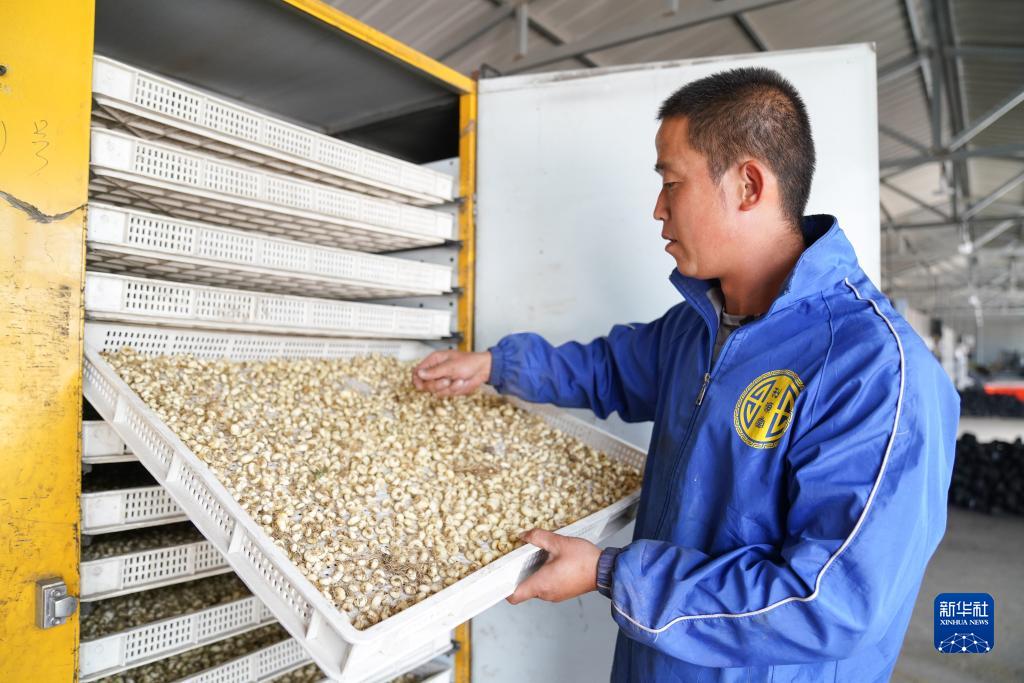 在滿(mǎn)江紅村的鐵力市裕盛平貝種植農民專(zhuān)業(yè)合作社,工人在烘干平貝(7月1日攝)。