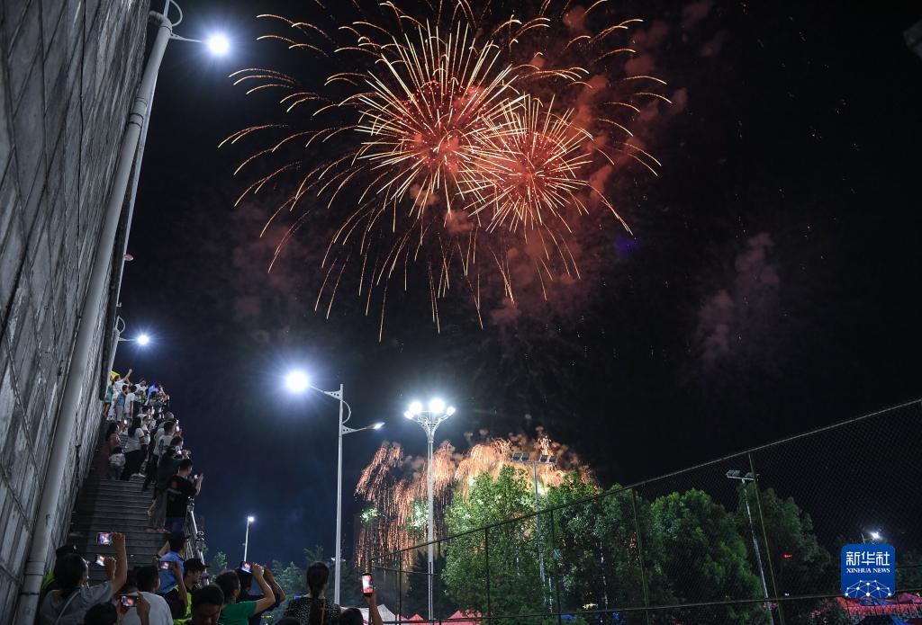7月1日,游客在貴州“村超”足球賽場(chǎng)旁觀(guān)看焰火表演。
