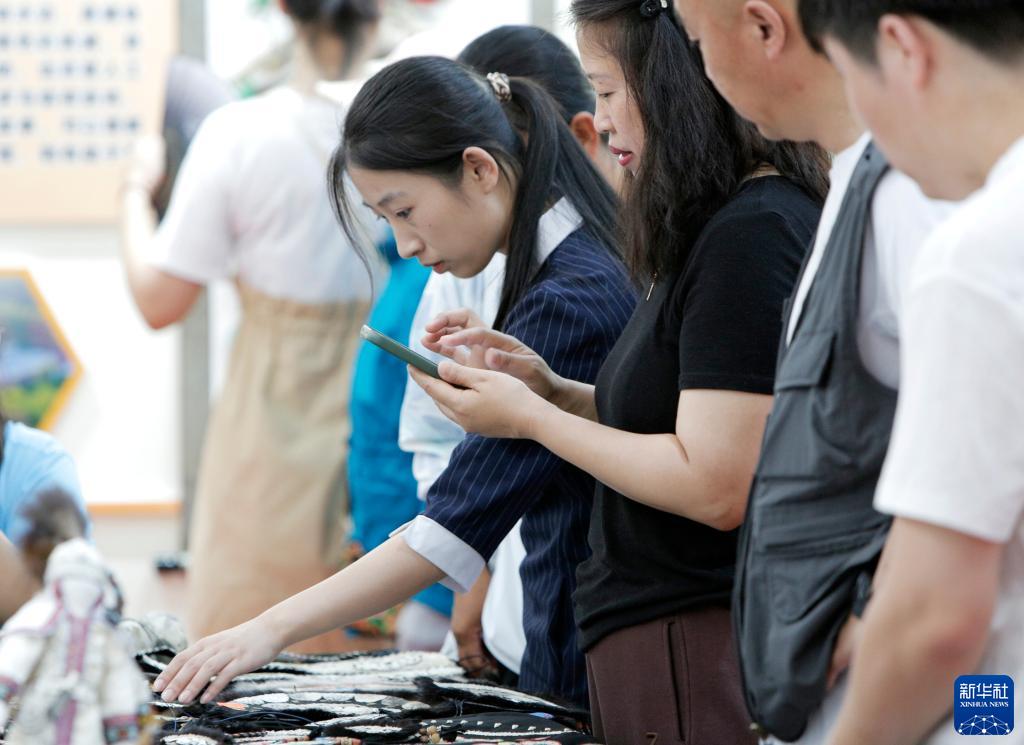7月2日,游客在第十一屆赫哲族烏日貢大會(huì )的赫哲族歷史文化長(cháng)廊查看魚(yú)皮掛件。