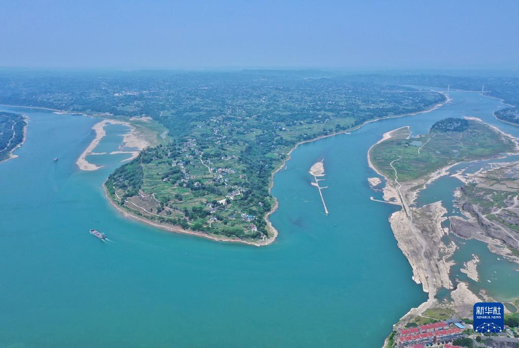 這是6月27日拍攝的神臂城全貌(無(wú)人機照片)。遠處大橋為5月27日通車(chē)的神臂城長(cháng)江大橋。