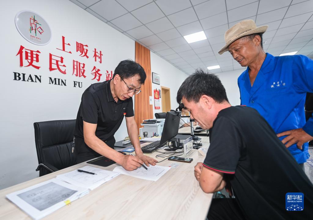 7月3日,在諸暨市店口鎮上畈村的便民服務(wù)站內,代辦員屠茂虎(左一)在為村民辦理社保業(yè)務(wù)。