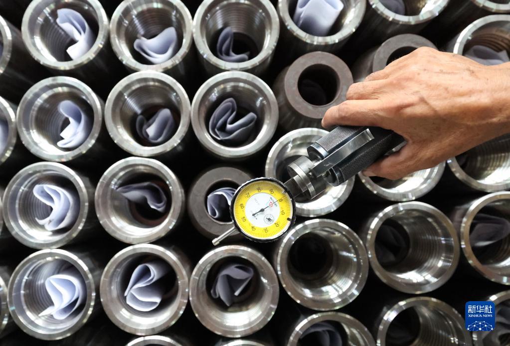 7月3日,在河北省晉州市營(yíng)里鎮一家地質(zhì)裝備生產(chǎn)企業(yè),工人測量鉆頭螺紋尺寸。