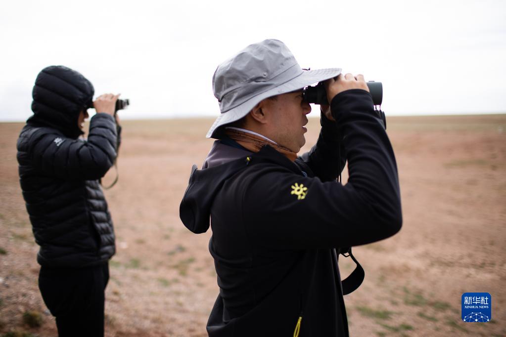 6月15日,中國科學(xué)院西北高原生物研究所研究員連新明(右)和他的學(xué)生王東在可可西里用望遠鏡觀(guān)察藏羚羊遷徙情況。