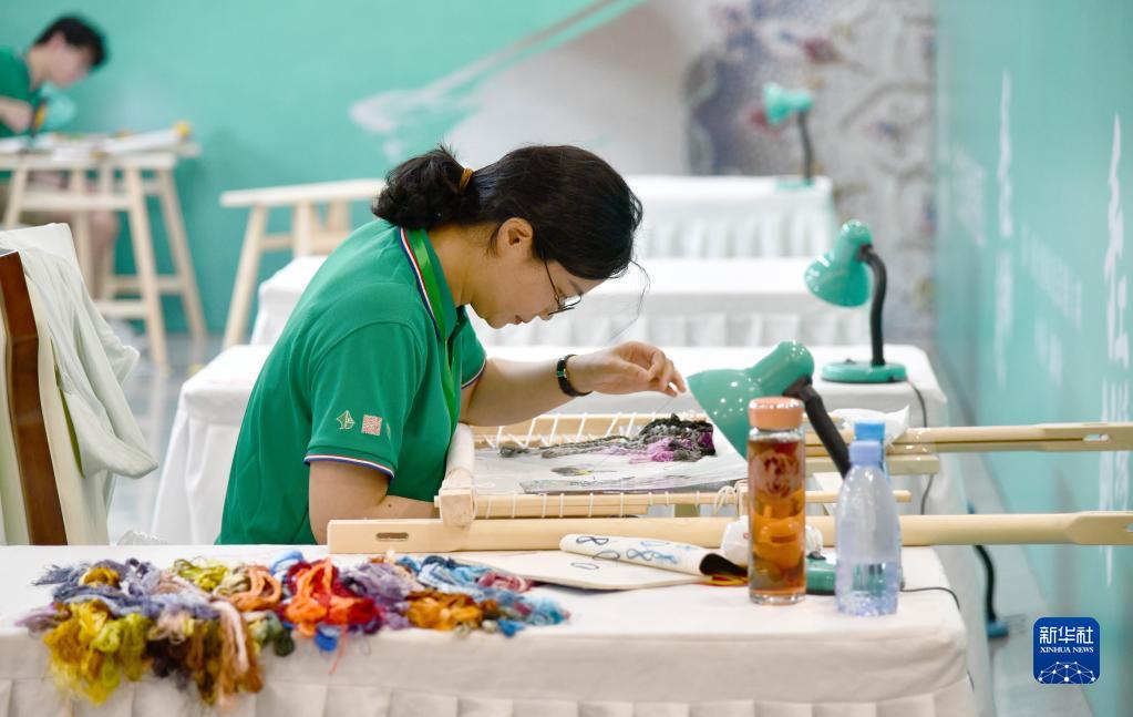 7月3日,在第一屆全國農民技能大賽上,選手參加手工刺繡項目比賽。