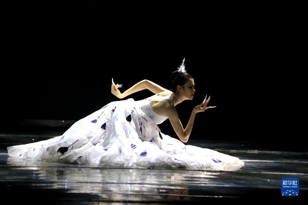 7月3日,在西北師范大學(xué)敦煌學(xué)院實(shí)驗劇場(chǎng),舞者為觀(guān)眾表演舞蹈《雀之靈》。