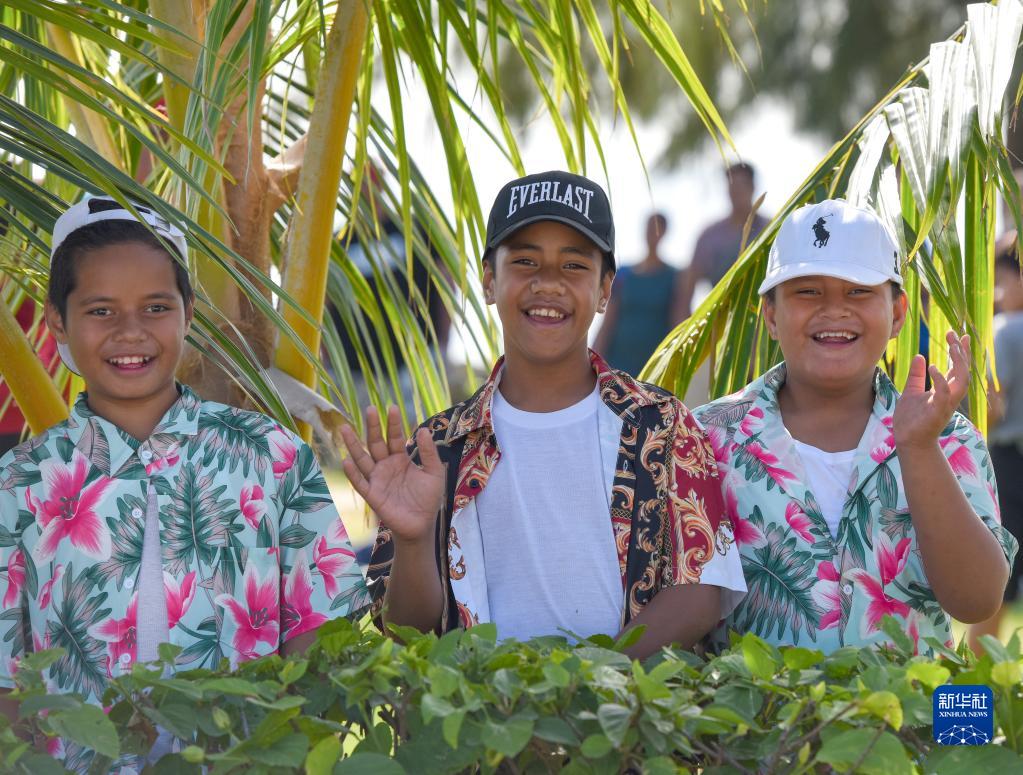 這是7月4日在湯加首都努庫阿洛法拍攝的觀(guān)看花車(chē)游行活動(dòng)的兒童。