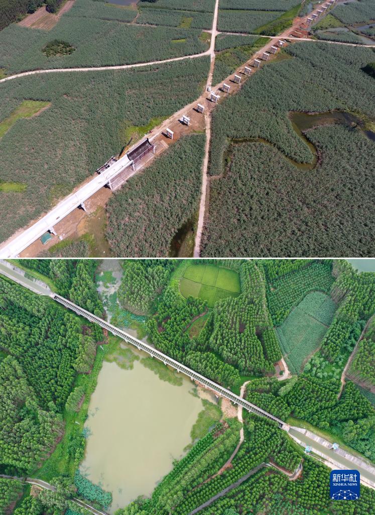 拼版照片:上圖為在廣西來(lái)賓市興賓區遷江鎮拍攝的正在施工建設中的“桂中治旱”工程一處引水渡槽(無(wú)人機照片,2018年9月21日攝);下圖為在廣西來(lái)賓市興賓區遷江鎮拍攝的已經(jīng)建成通水的“桂中治旱”工程一處引水渡槽(無(wú)人機照片,2023年7月4日攝)。