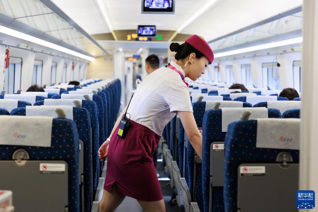 7月5日,在55301次試驗列車(chē)上,乘務(wù)員整理車(chē)廂座椅。