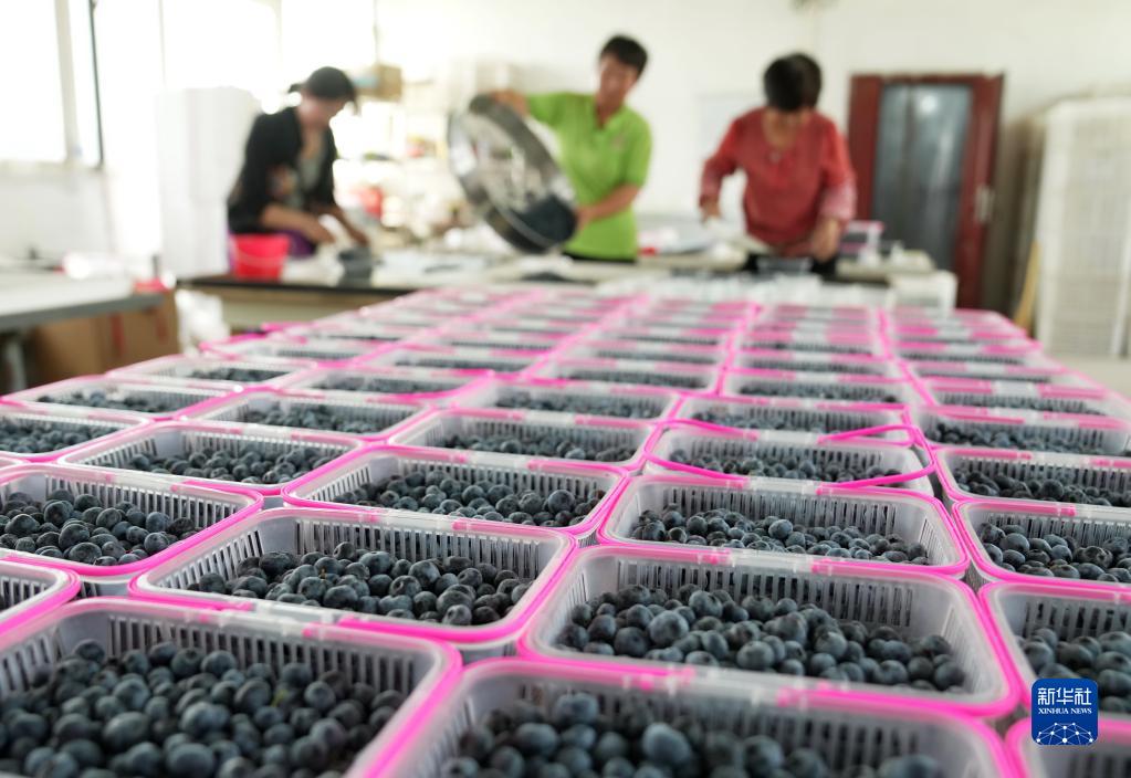 7月5日,河北省灤州市東安各莊鎮三山院村一家藍莓種植合作社的社員在分裝采摘的藍莓。