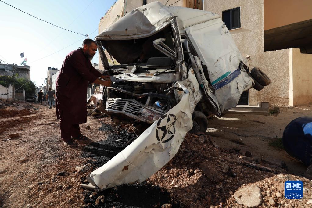 7月5日,一名巴勒斯坦人在約旦河西岸杰寧查看一輛受損的車(chē)輛。