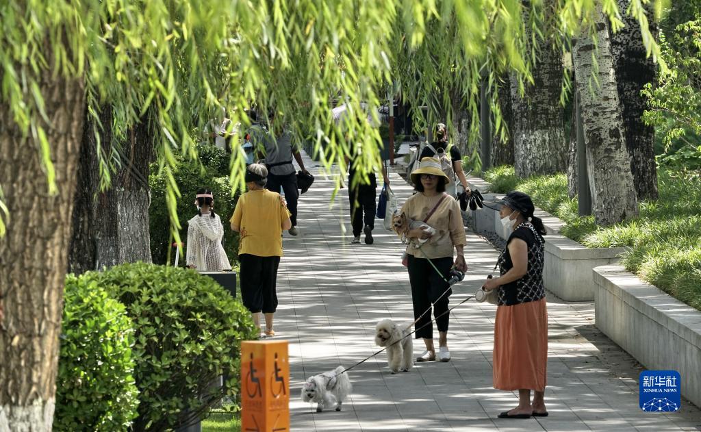 7月5日,市民在環(huán)境優(yōu)美的亮馬河畔休閑散步。