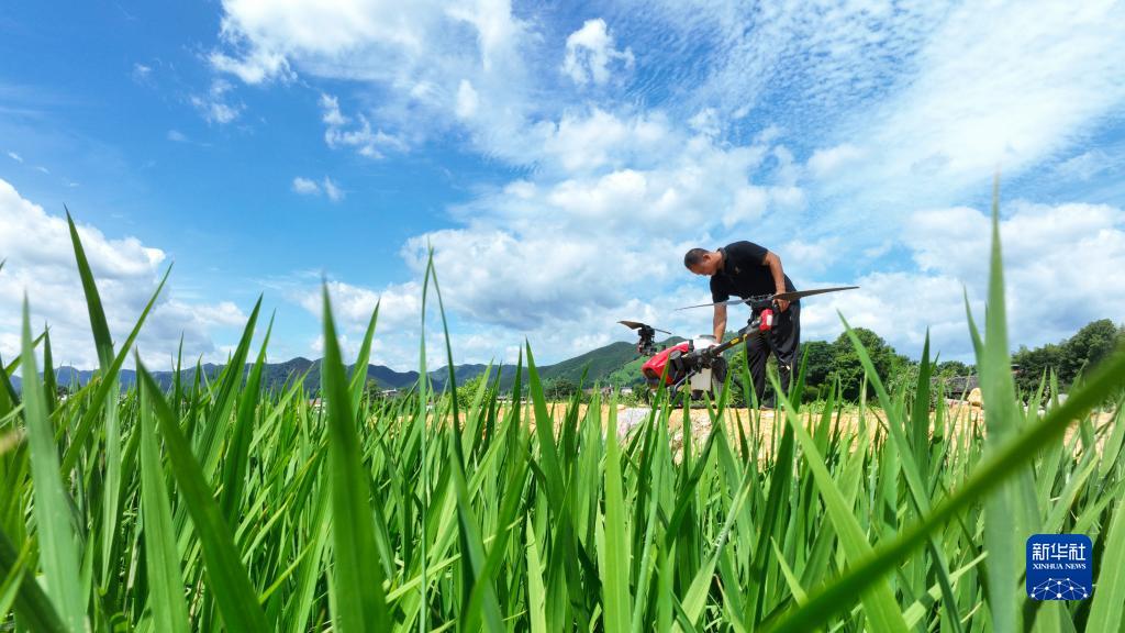 7月5日,在湖南省常寧市洋泉鎮坦沖村,農技員為植保無(wú)人機加裝生物農藥,為飛防作業(yè)做準備。