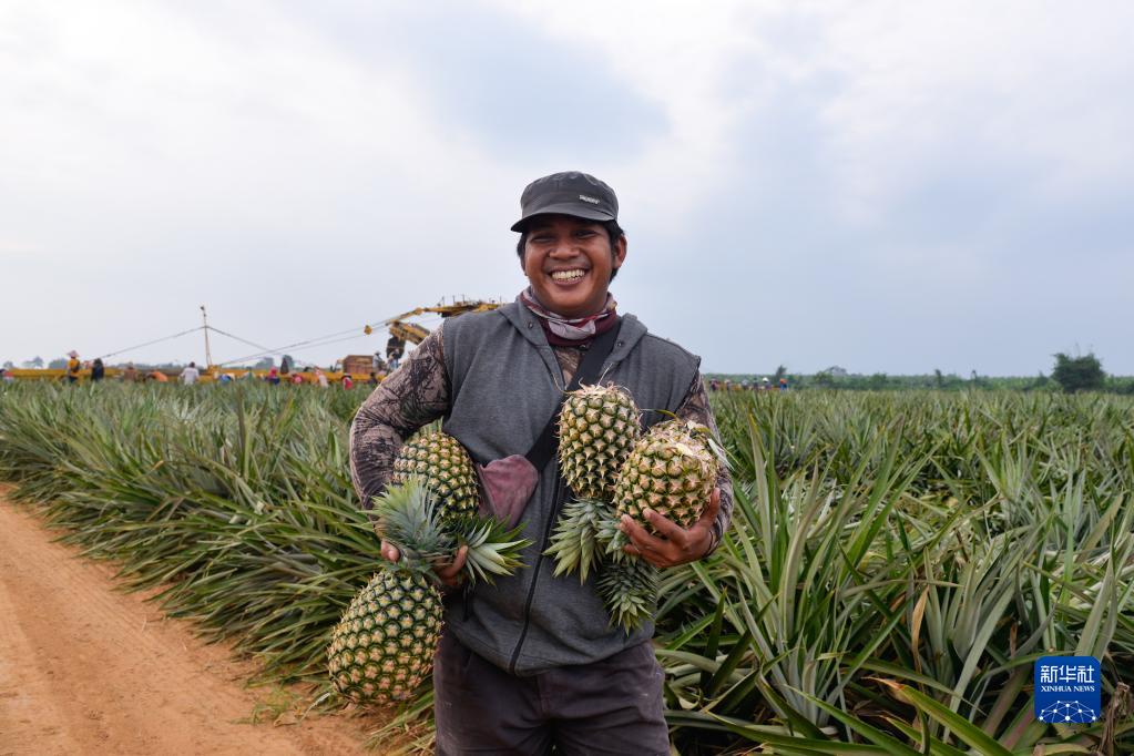 7月5日,在印度尼西亞楠榜省德邦易勿剎縣一處菠蘿種植園,一名采摘工人展示菠蘿。