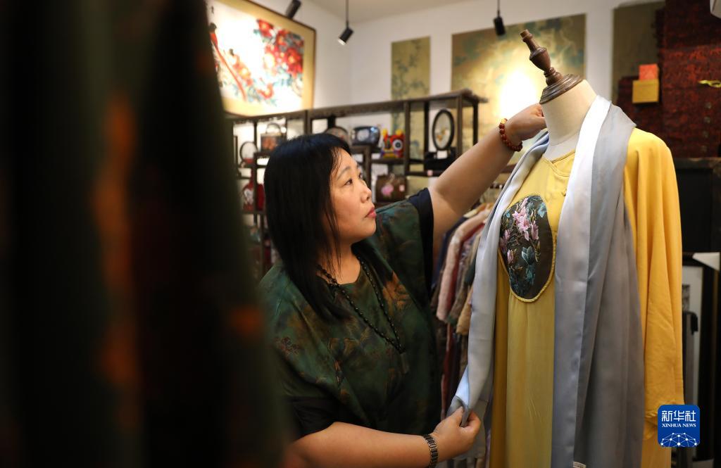 7月5日,王立君在位于遼寧省營(yíng)口市遼河老街上的工作室里為她設計的帶有滿(mǎn)繡圖案的民族服飾進(jìn)行搭配。