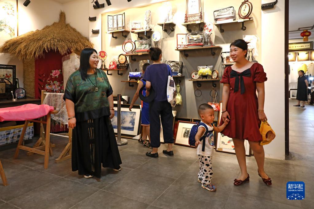 7月5日,王立君(左)在位于遼寧省營(yíng)口市遼河老街上的工作室里為前來(lái)參觀(guān)的游客介紹滿(mǎn)繡創(chuàng )作。