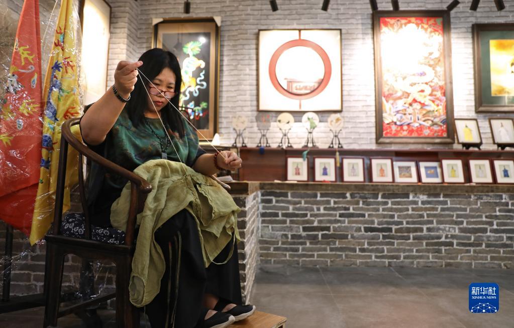 7月5日,王立君在位于遼寧省營(yíng)口市遼河老街上的工作室里為一件民族服飾加上刺繡。