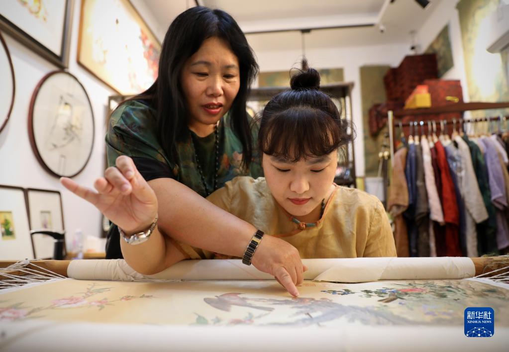 7月5日,王立君(左)在位于遼寧省營(yíng)口市遼河老街上的工作室里給女兒池明明指導滿(mǎn)繡創(chuàng )作技藝。
