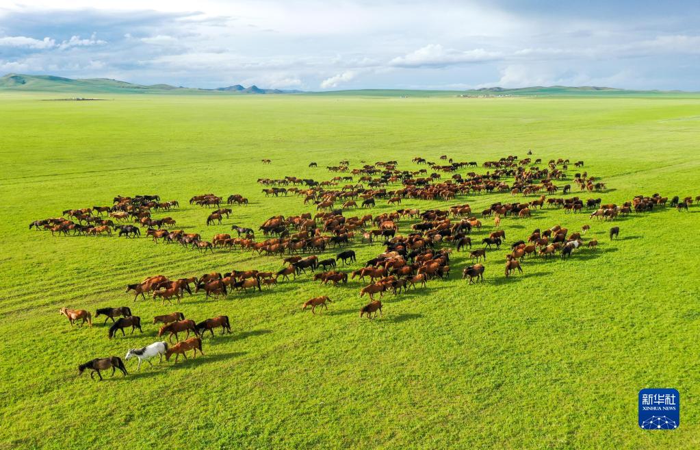 7月5日,馬群在草原上奔跑(無(wú)人機照片)。