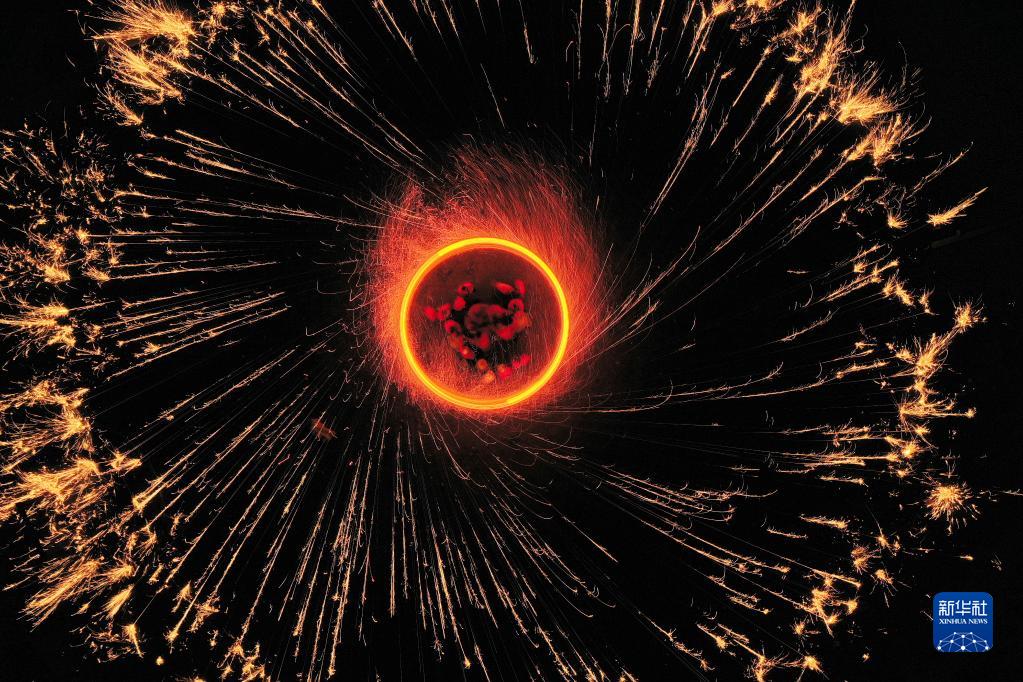 “掄花”是河北省灤平縣一項傳統民俗,已被列入國家級非物質(zhì)文化遺產(chǎn)名錄。表演時(shí),幾名民間藝人將木炭和碎鐵片一起放到掛在花架上的花筒中燃燒,再合力掄起花架,使花筒內升溫并向四周甩濺鐵花,形成一圈圈光線(xiàn)交織的光環(huán),景象壯觀(guān)。